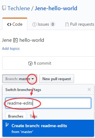 此时,仓库里就有了两个分支,主分支 master 和 分支 readme-edits 。它们现在是完全相同的。下一步就是在新分支中添加更改的内容。