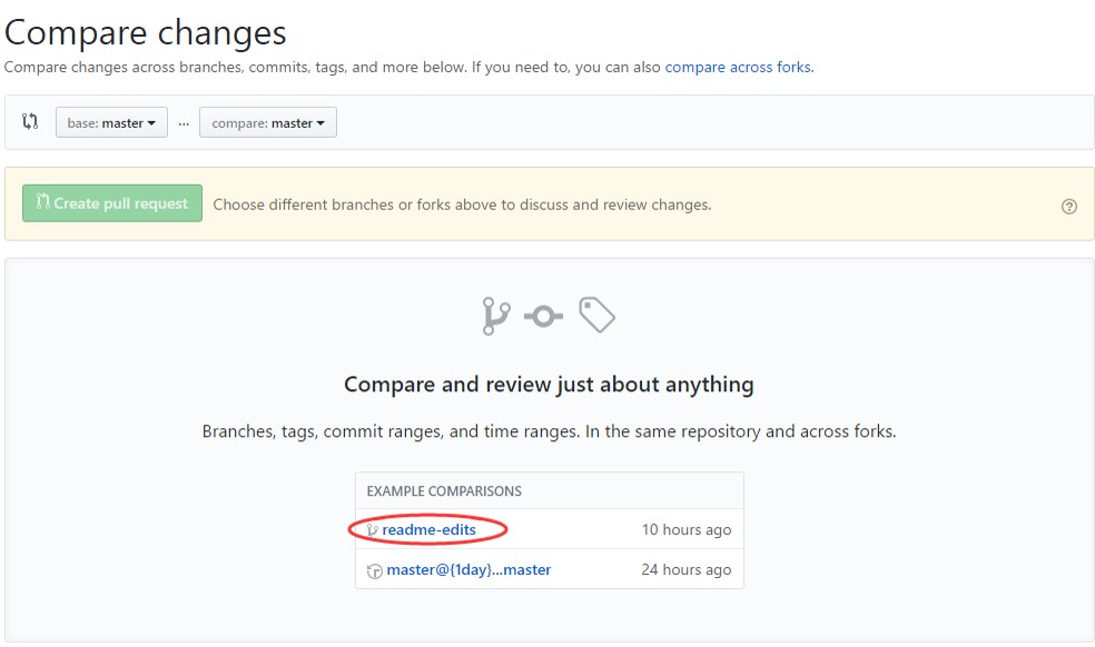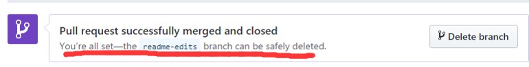 因为更改已经被包含进了 master 分支,可以删除 readme-edits 分支了。 可以看到紫色方形后面的指示:You’re all set—the readme-edits branch can be safely deleted.