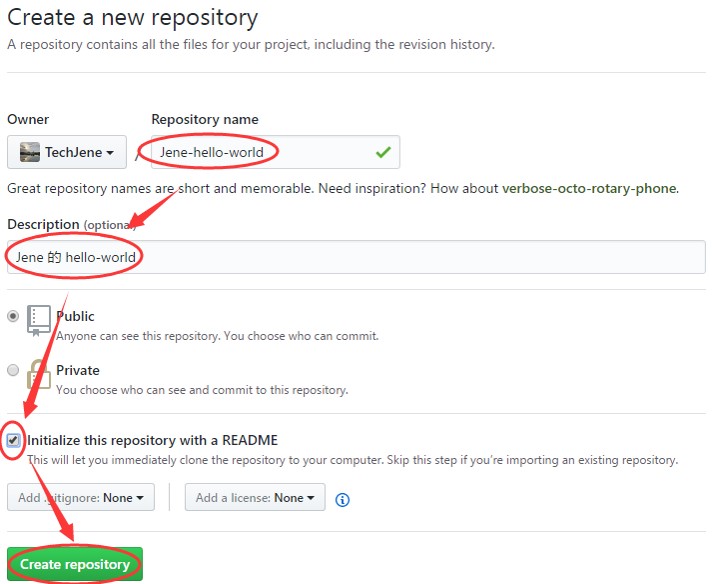 命名仓库为 hello-world ,或者任何你喜欢的名字,我命名为 Jene-hello-world 。